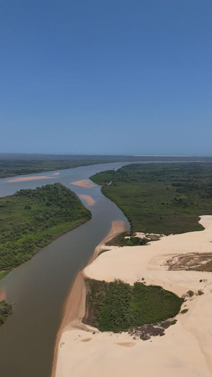 – Parada na Caída do Morro para banho de água doce , dunas de areia caindo no rio .