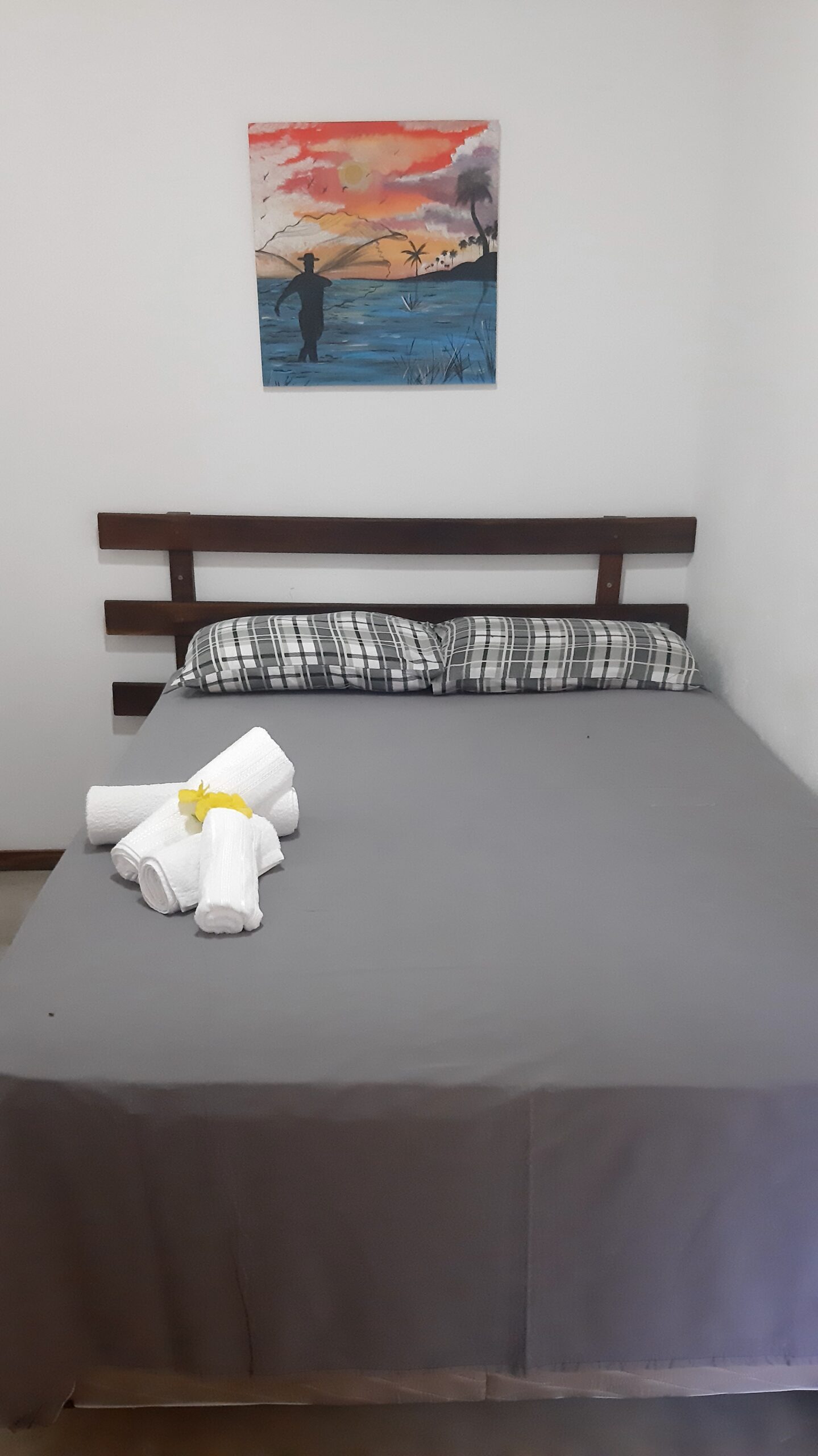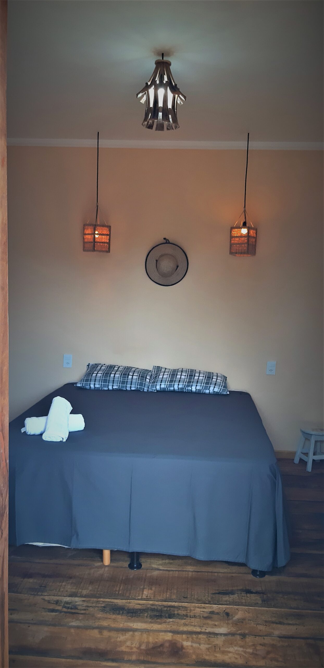 Chalé IV no piso superior: 1 cama de casal, frigobar, ar condicionado, armador de rede e banheiro privativo. Diária Casal R$340,00, TRIPLO R$420,00, QUADRUPLO R$500,00 com café da manhã