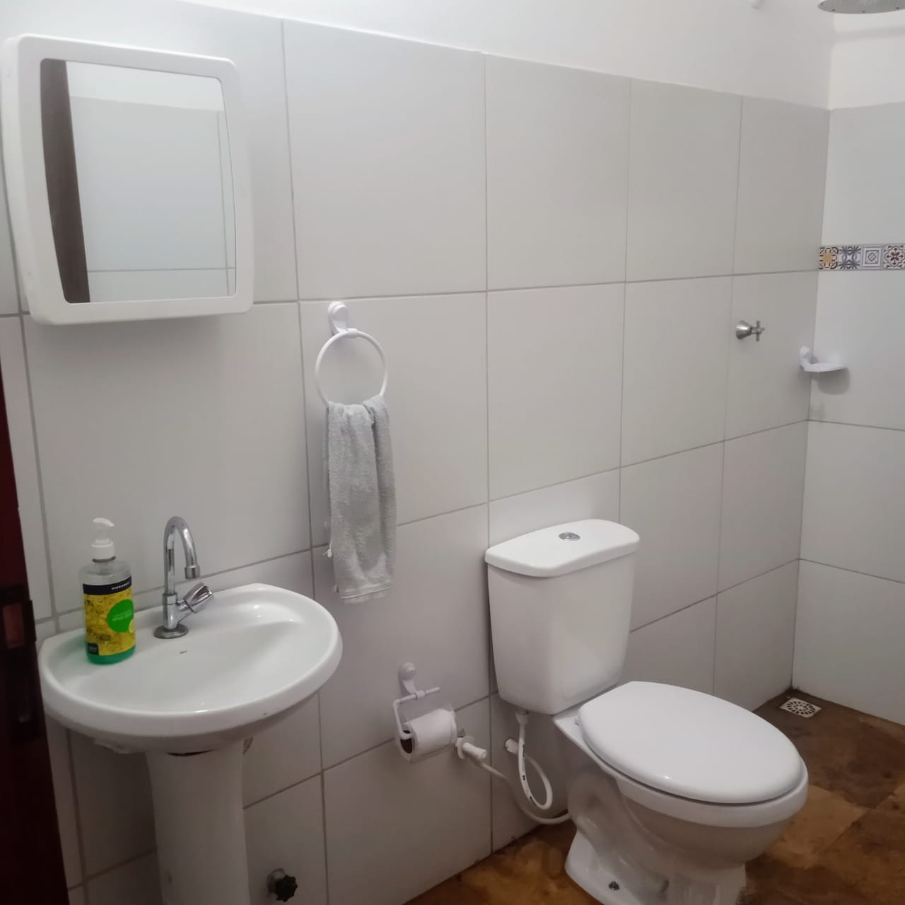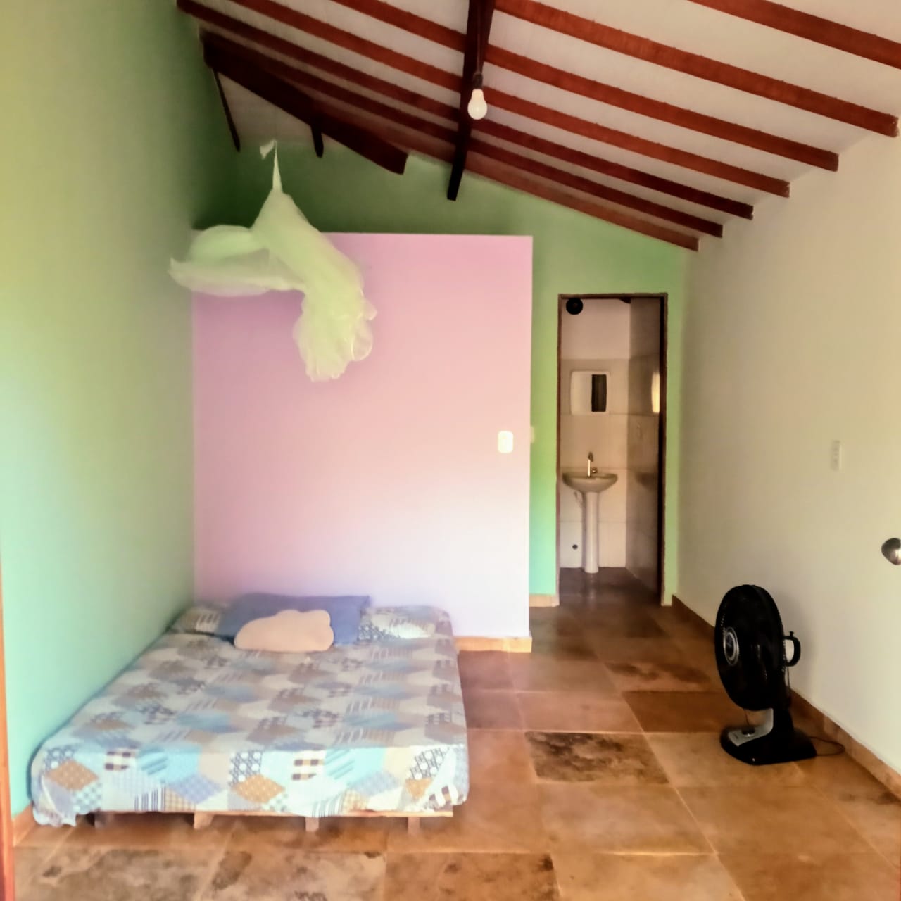 1 suíte + banheiro com chuveiro com ducha quente, uma cama de casal, roupa de cama, ventilador; (duas pessoas em camas)
