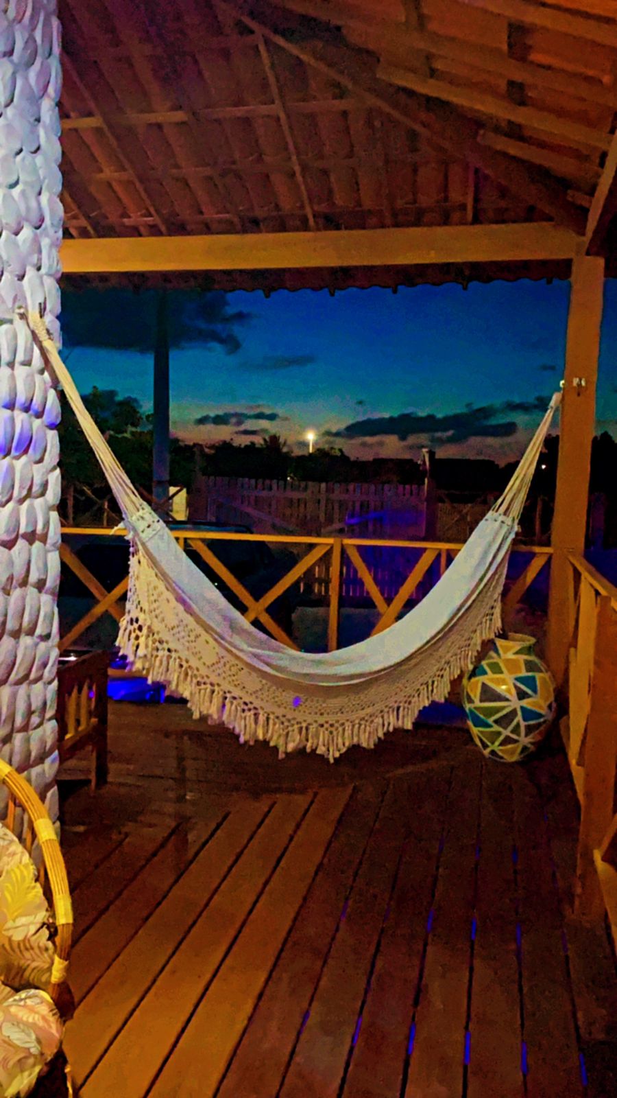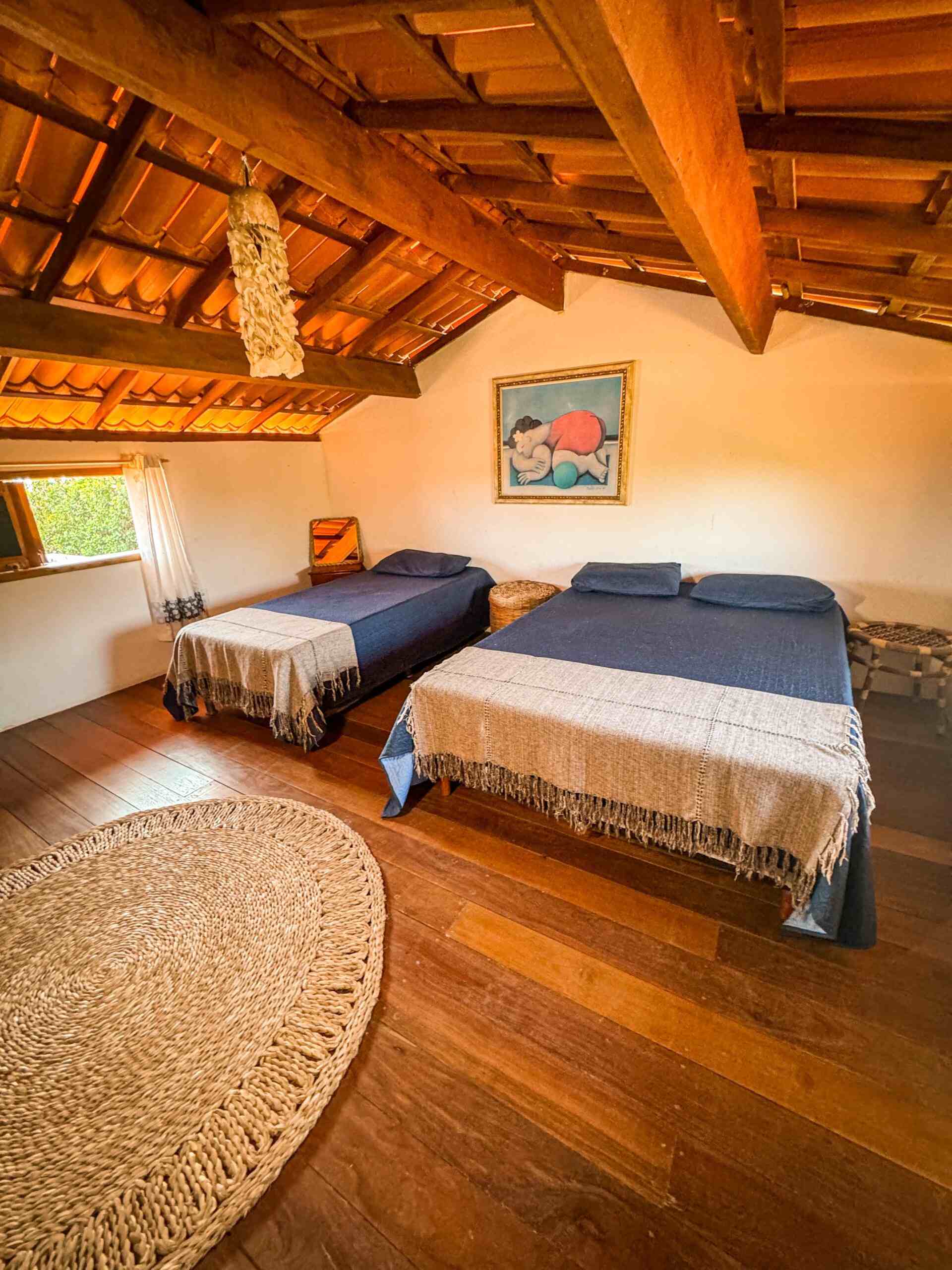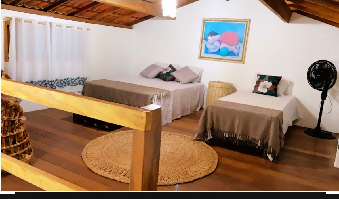 Quarto 02 Mezanino: Cama de casal, cama de solteiro, um par de armadores de rede e ventilador;