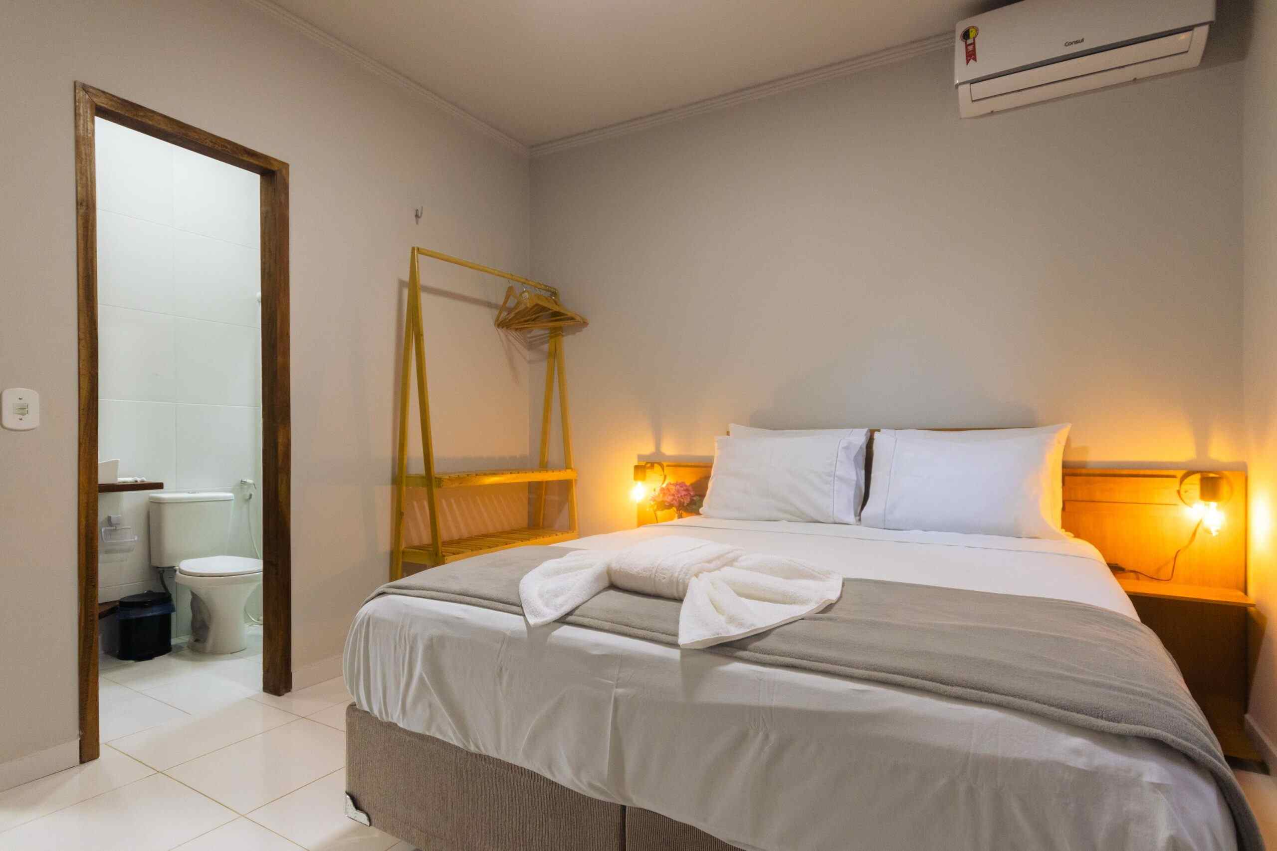 – 1 suíte: uma cama queen size, ar condicionado, tv a cabo e banheiro privativo;