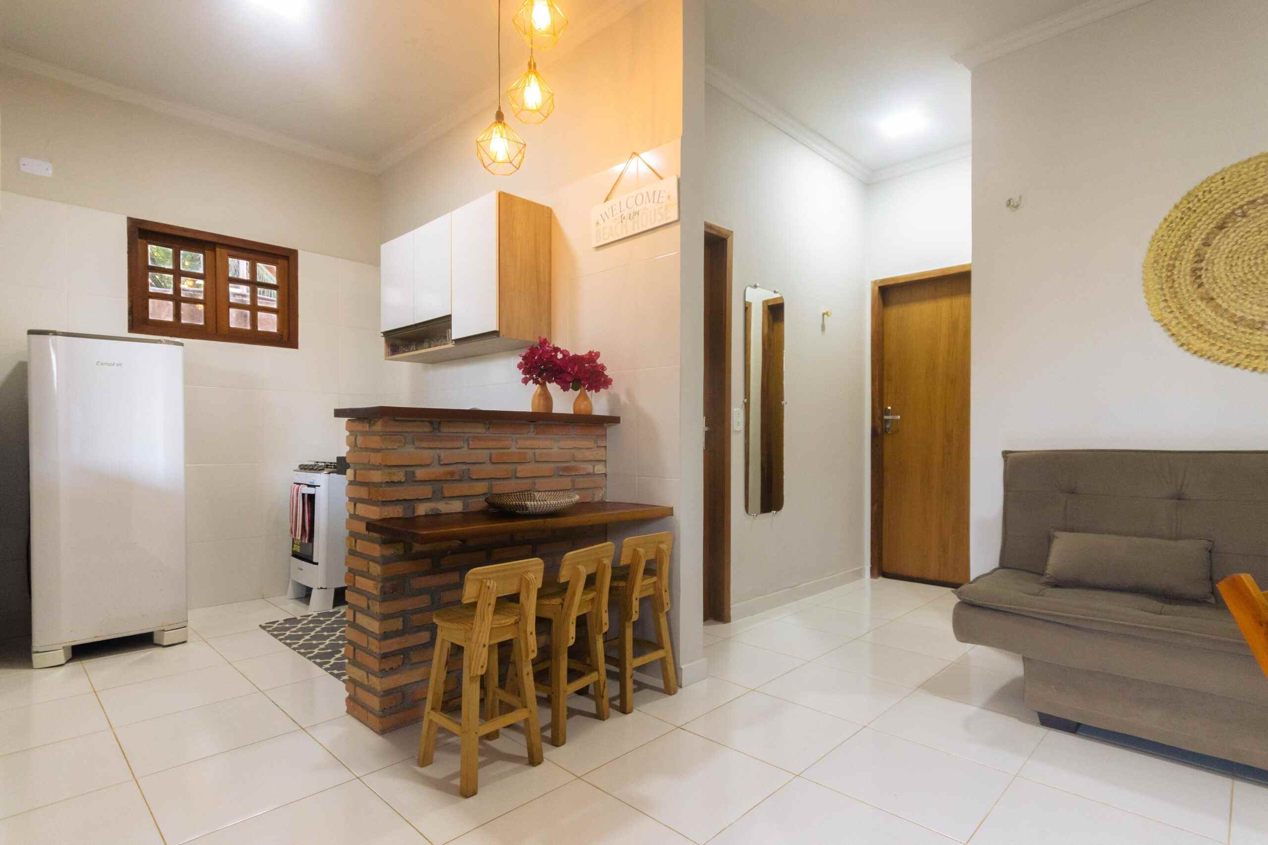 – 1 sala com sofá cama; 1 banheiro social; 1 cozinha completa com utensílios domésticos; armadores de rede em ambos os cômodos.