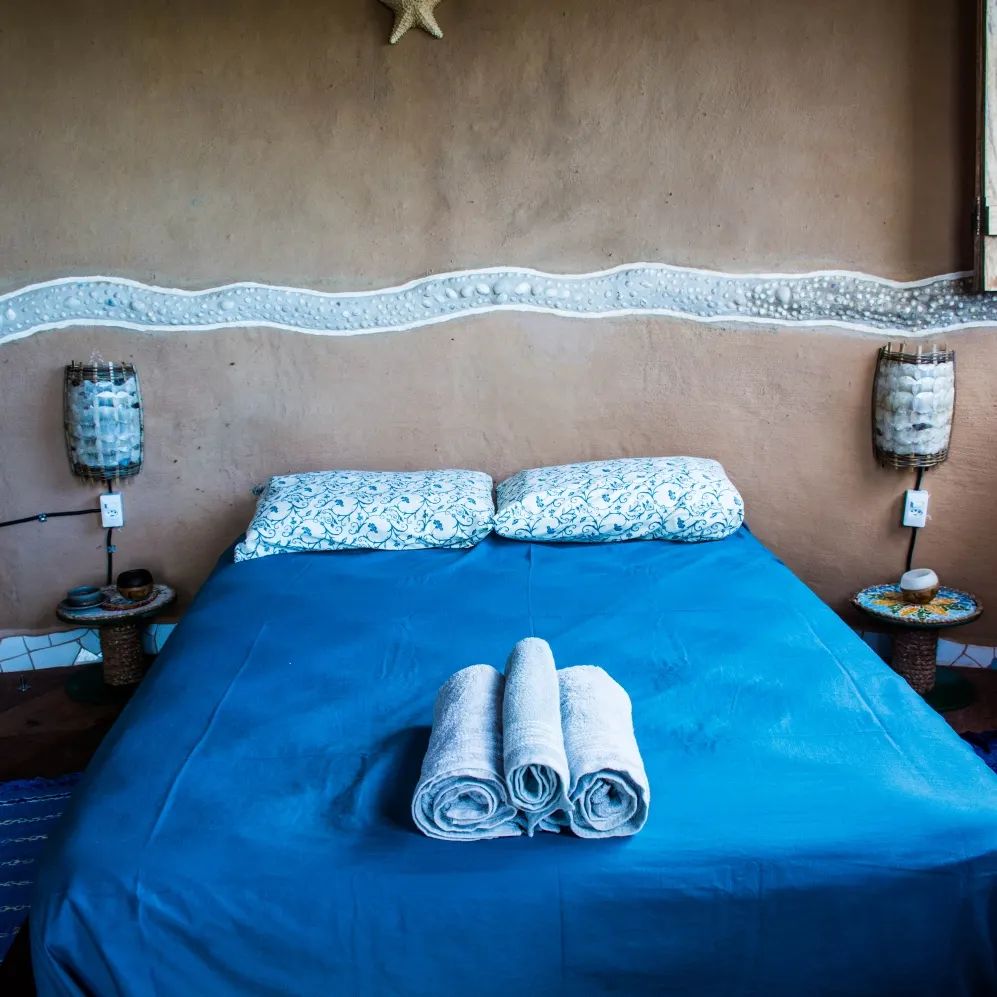 Suíte Vida (até 2 pessoas) com varanda e vista para o mar e mirante exclusivo: Uma cama de casal e banheiro privativo; diária casal R$220 e para 1 pessoa R$170