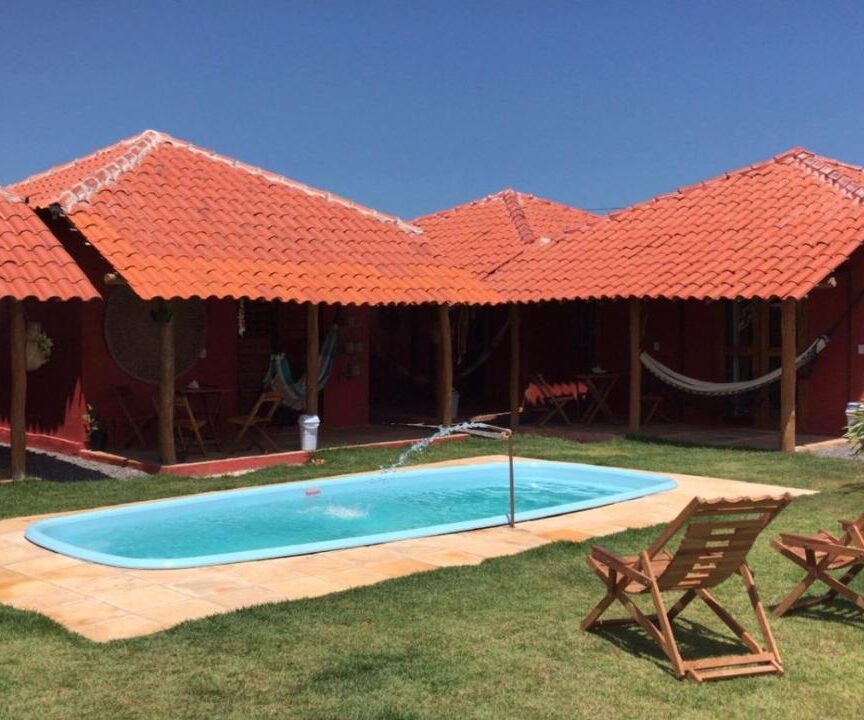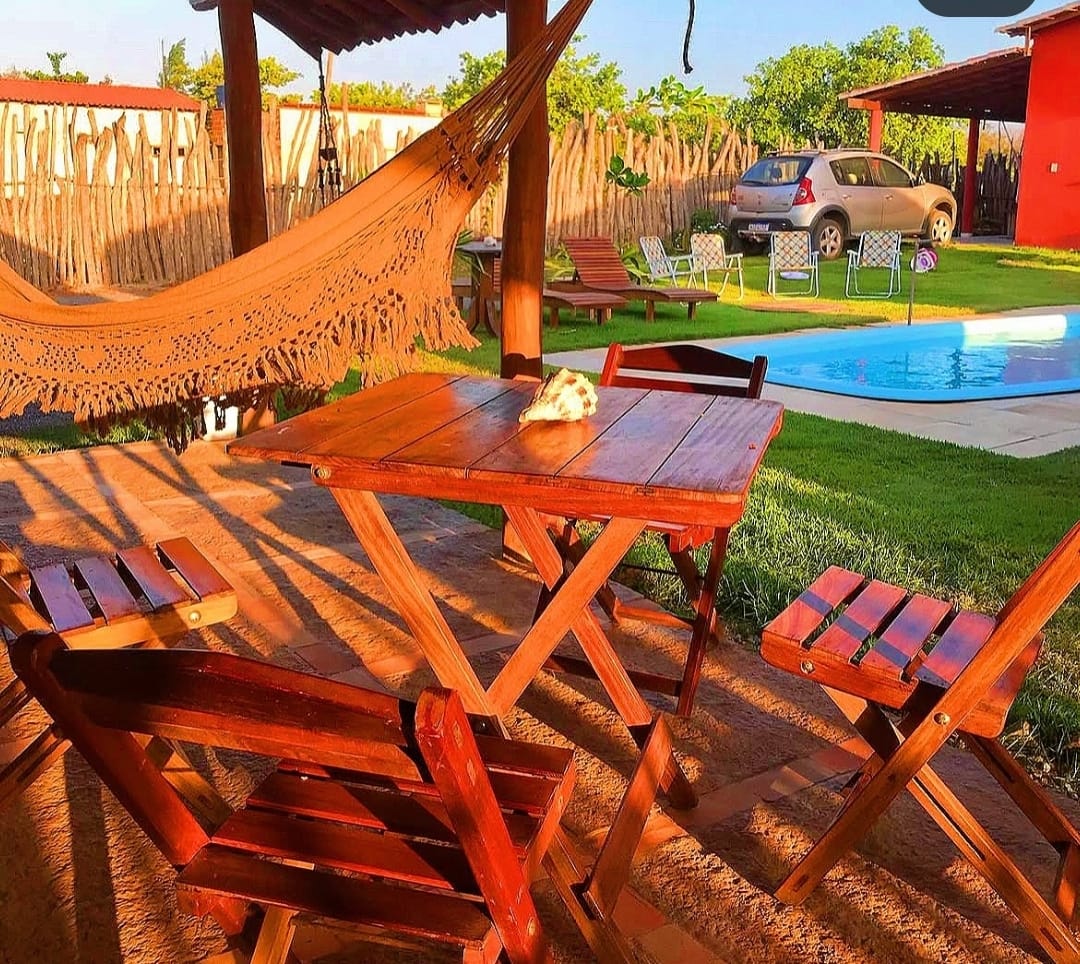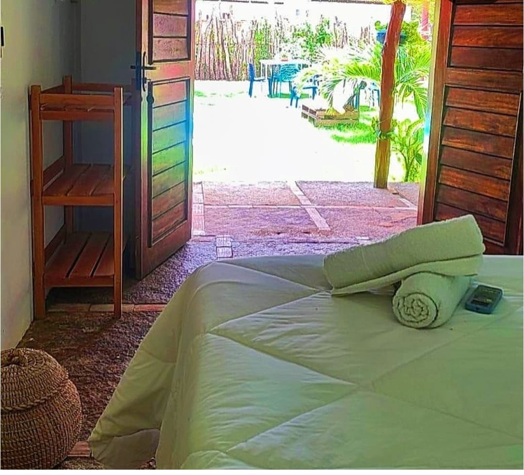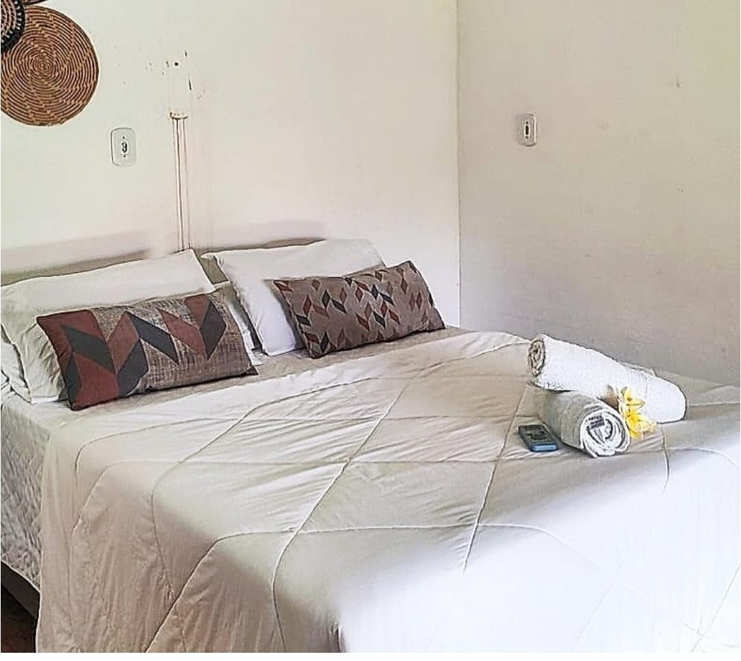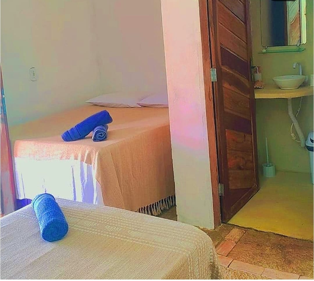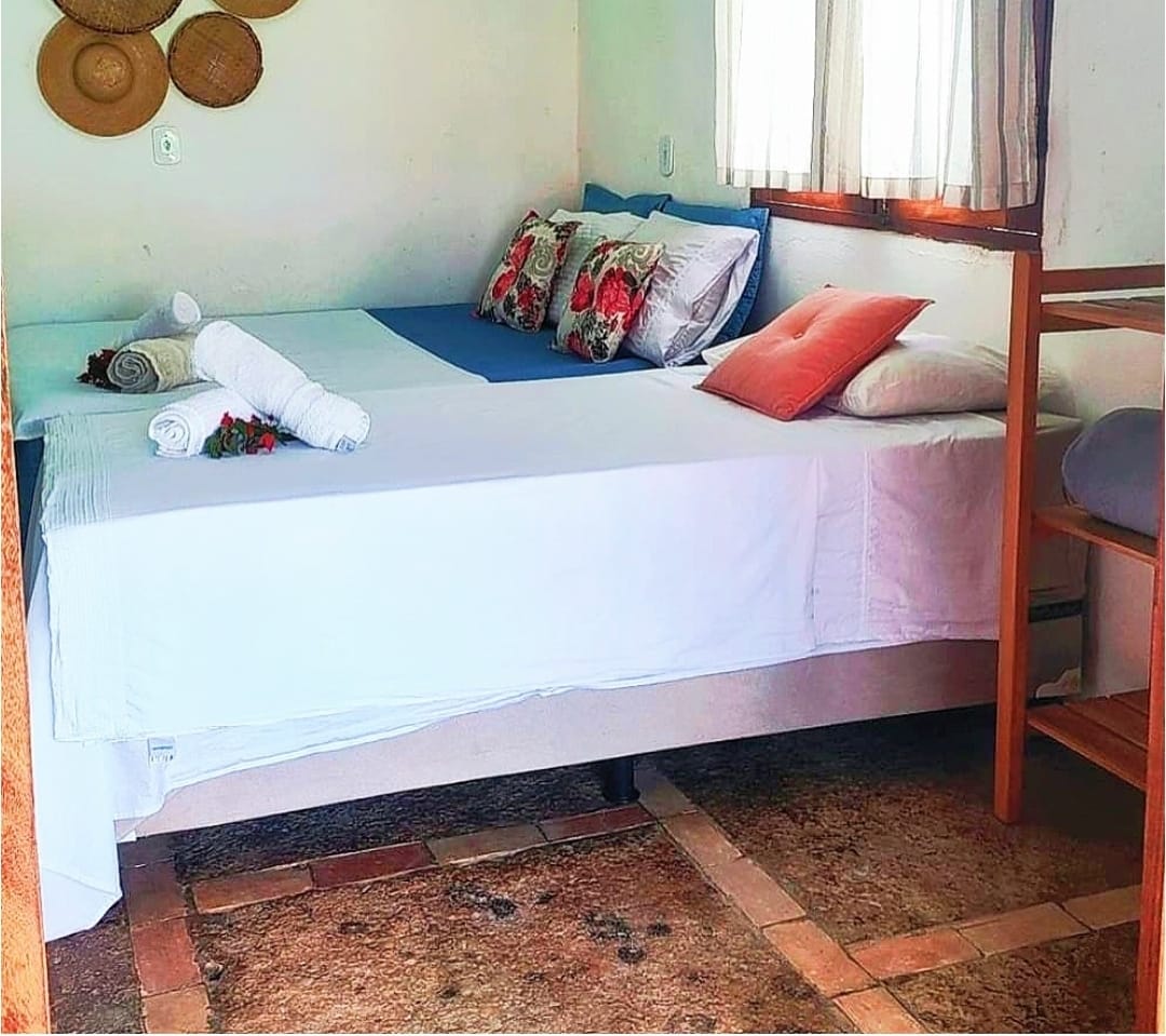 Chalés : 1 cama casal e 2 camas solteiro. e temos armadores no quarto para redes 02 chalés apena tem chuveiro quente.