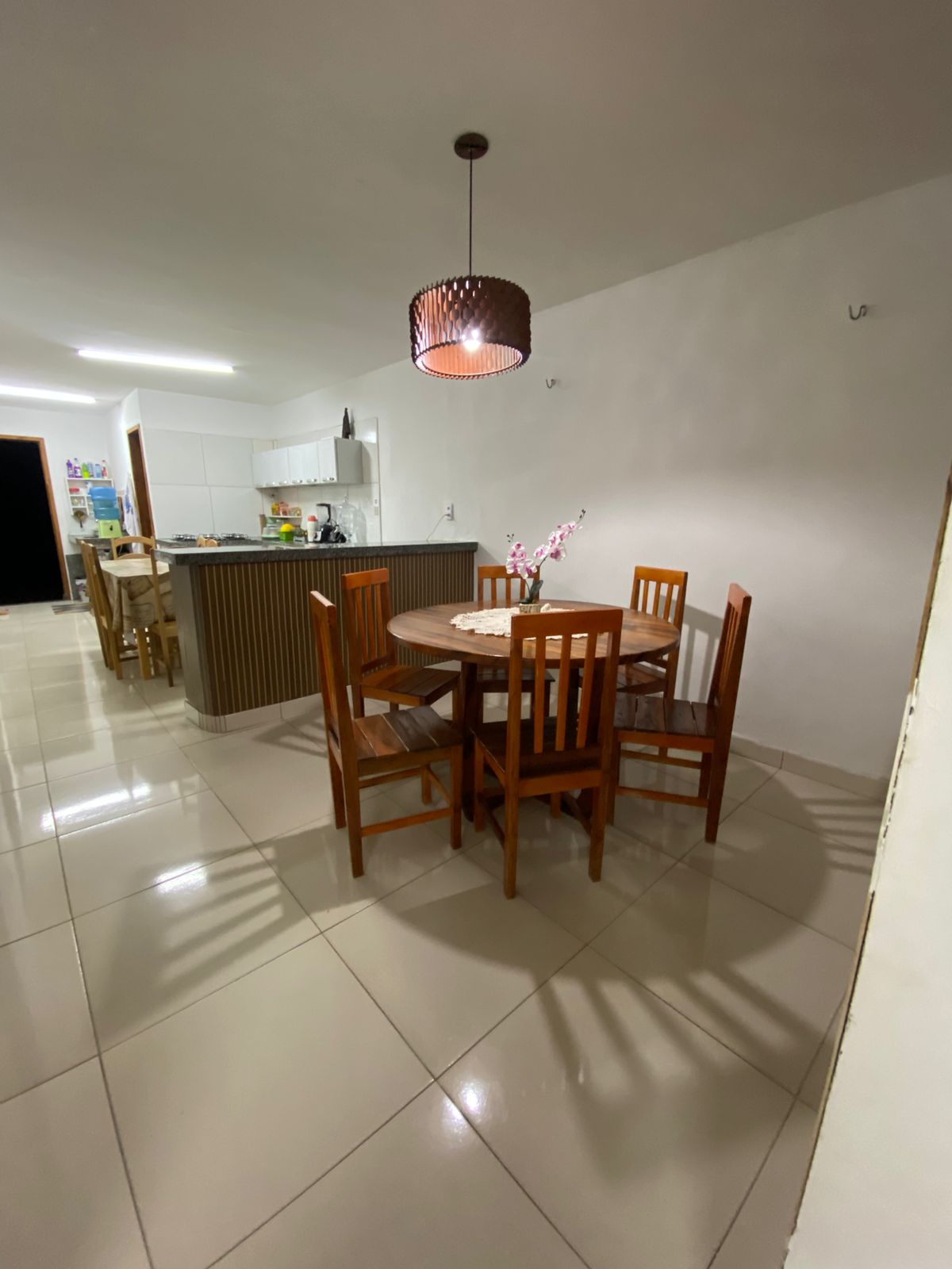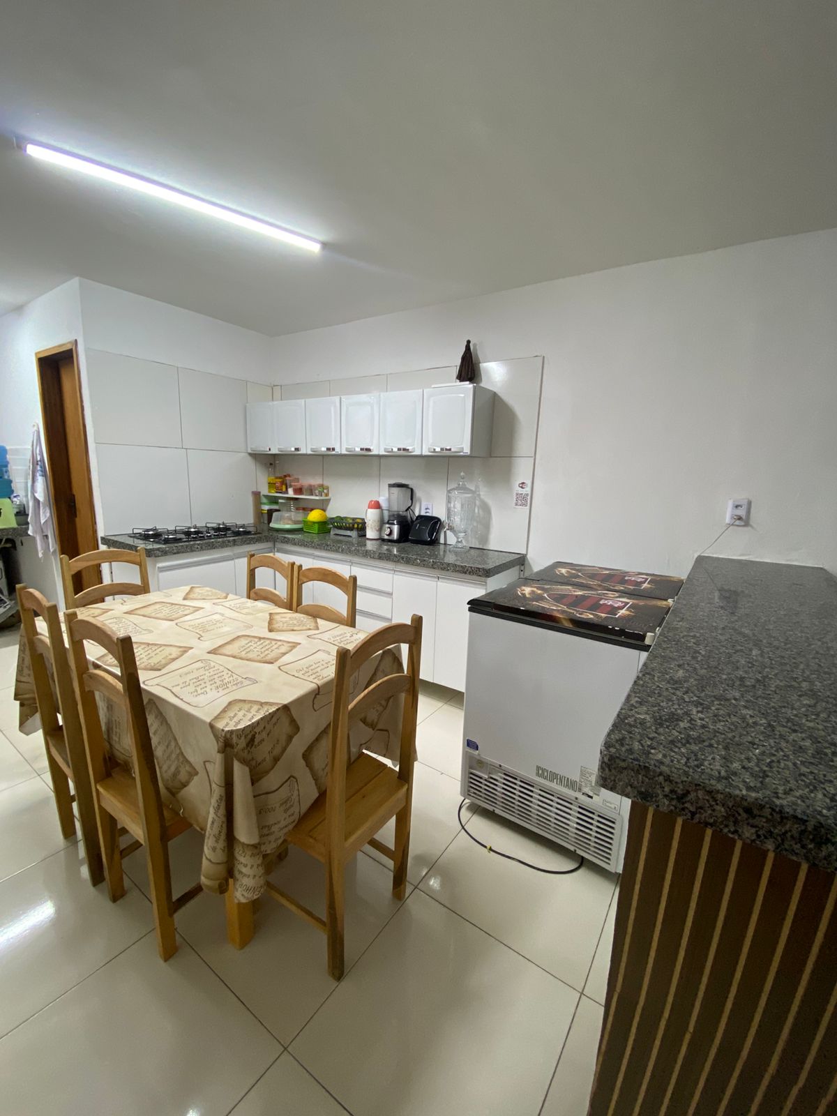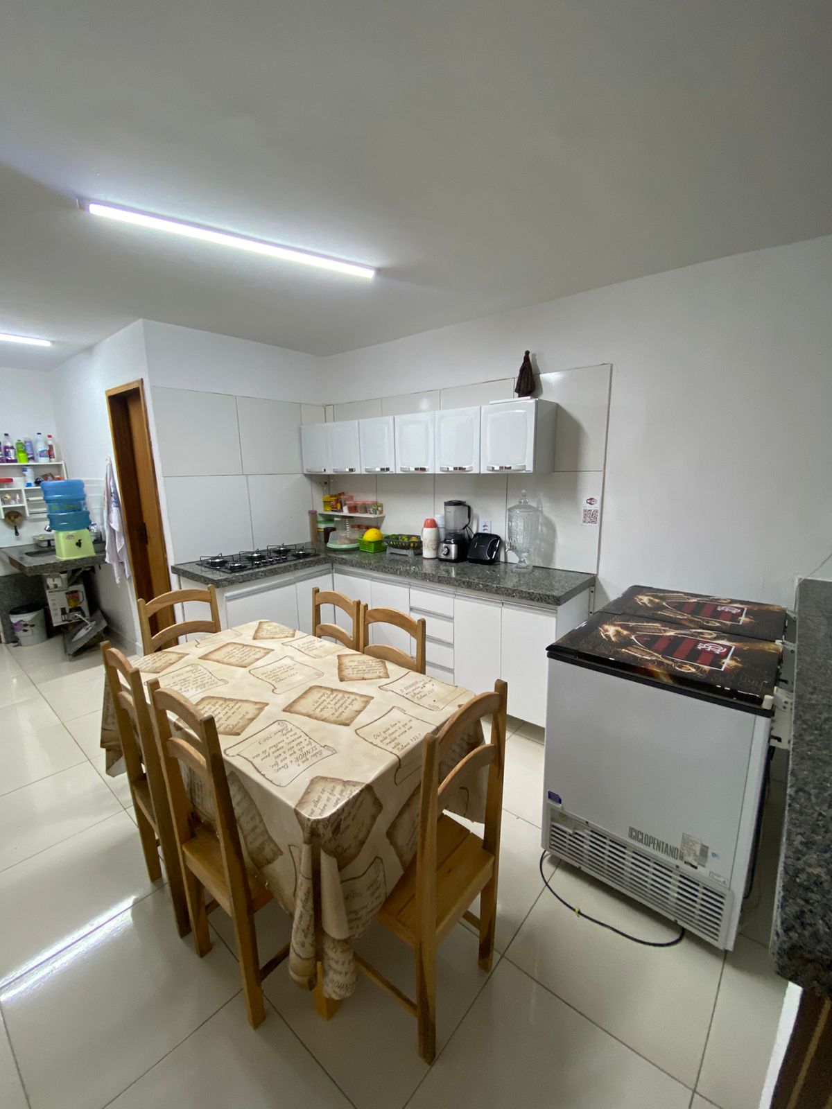 Sala de jantar: 1 mesa de madeira de seis lugares. Cozinha completa (sanduicheira, fogão tipo Cook Top de 5 queimadores, freezer de duas portas, armário planejado, panelas em geral, talheres, pratos, copos, temperos secos (condimentos). Ps.: Todos os quartos da propriedade contém um ventilador.