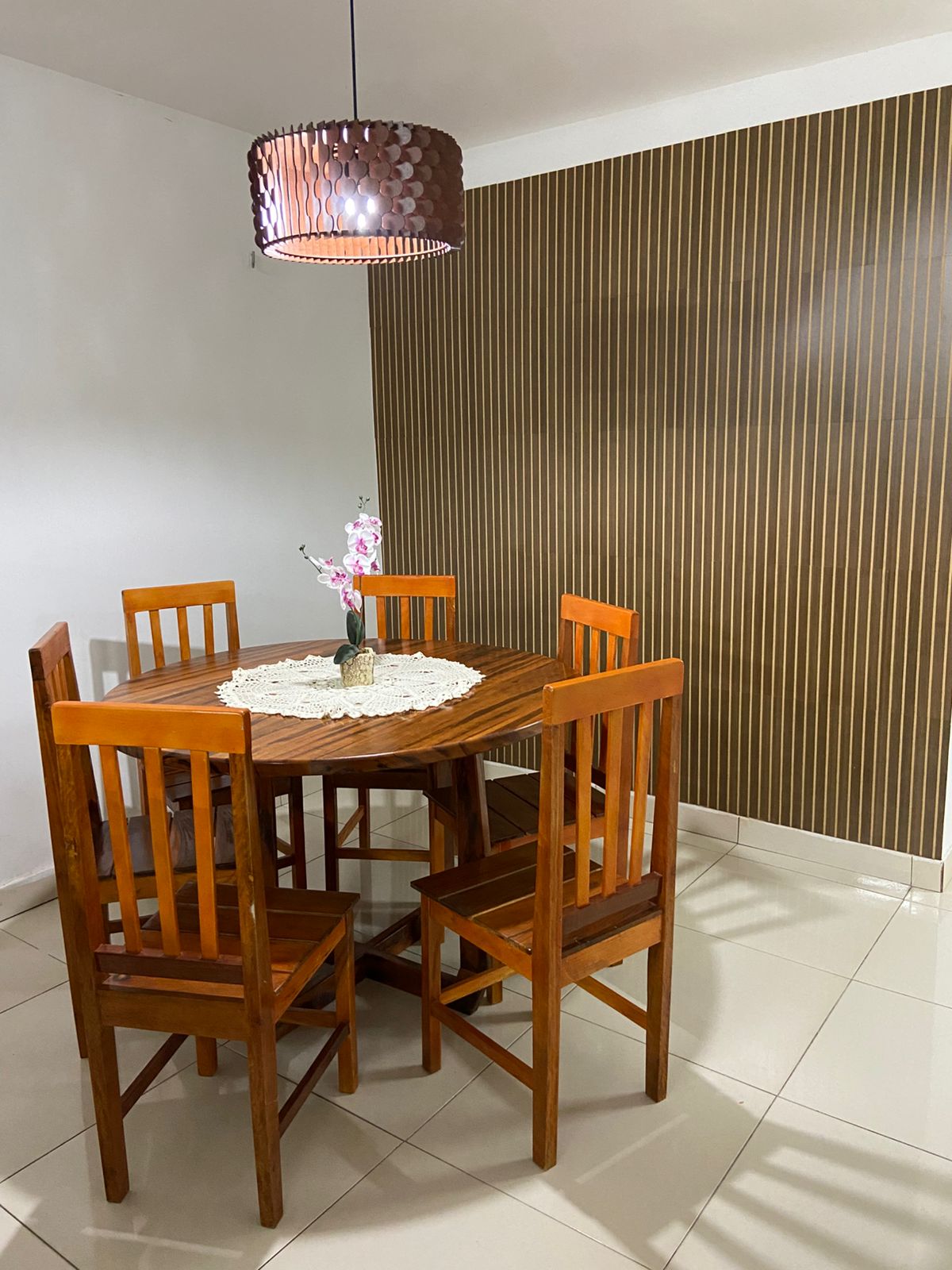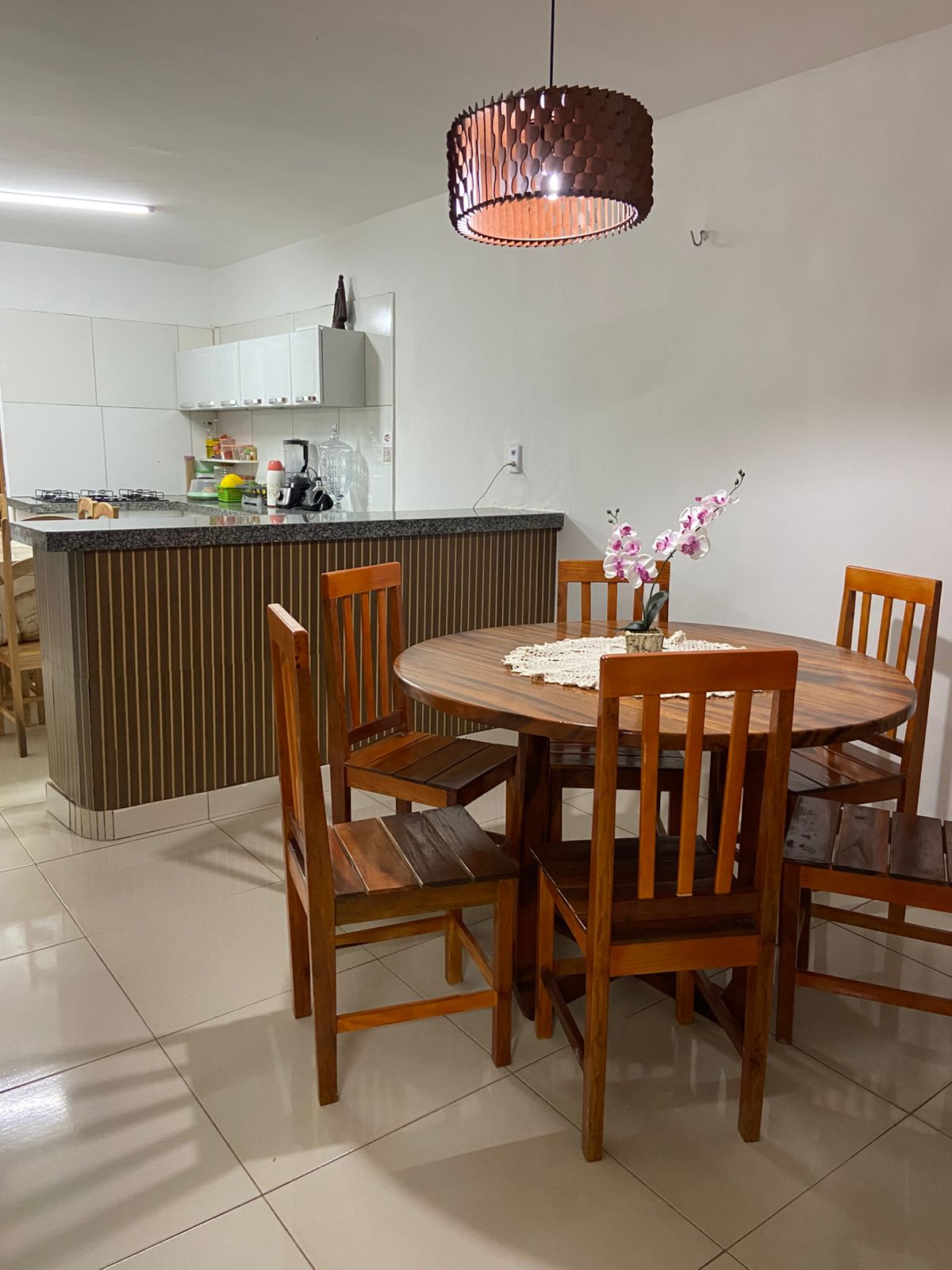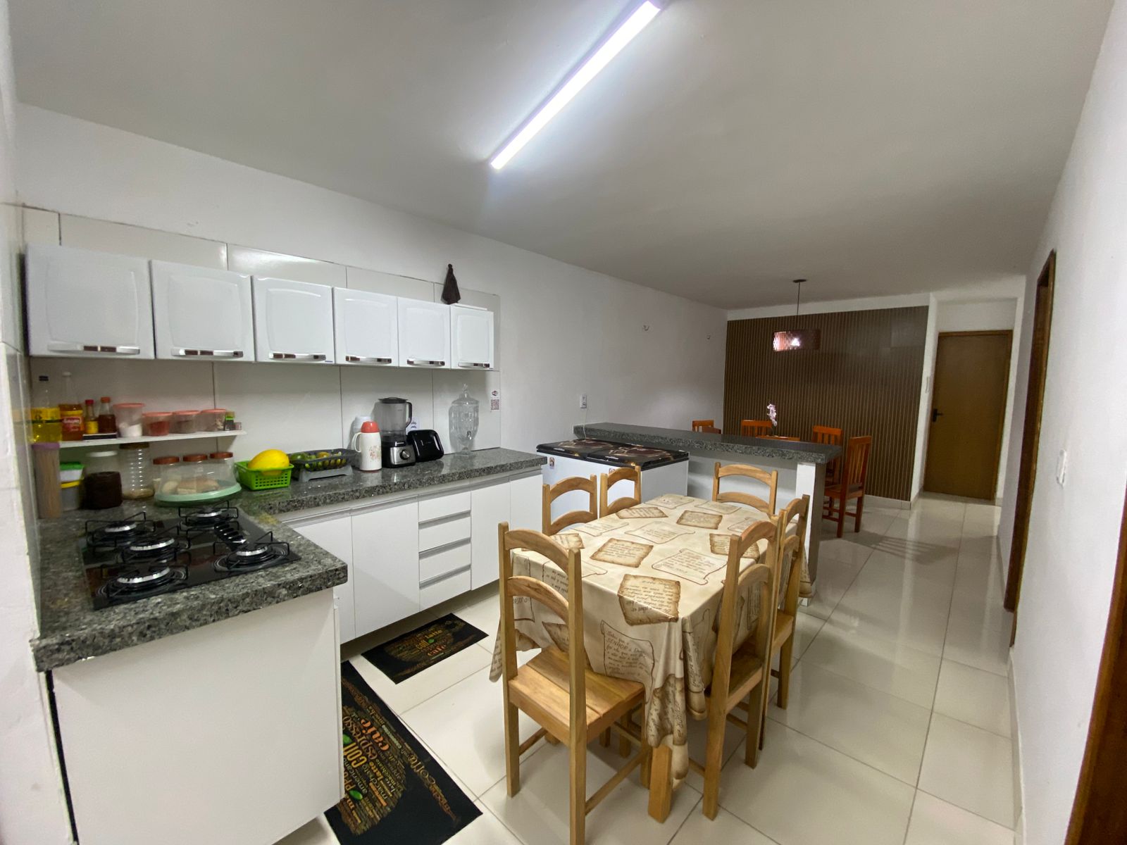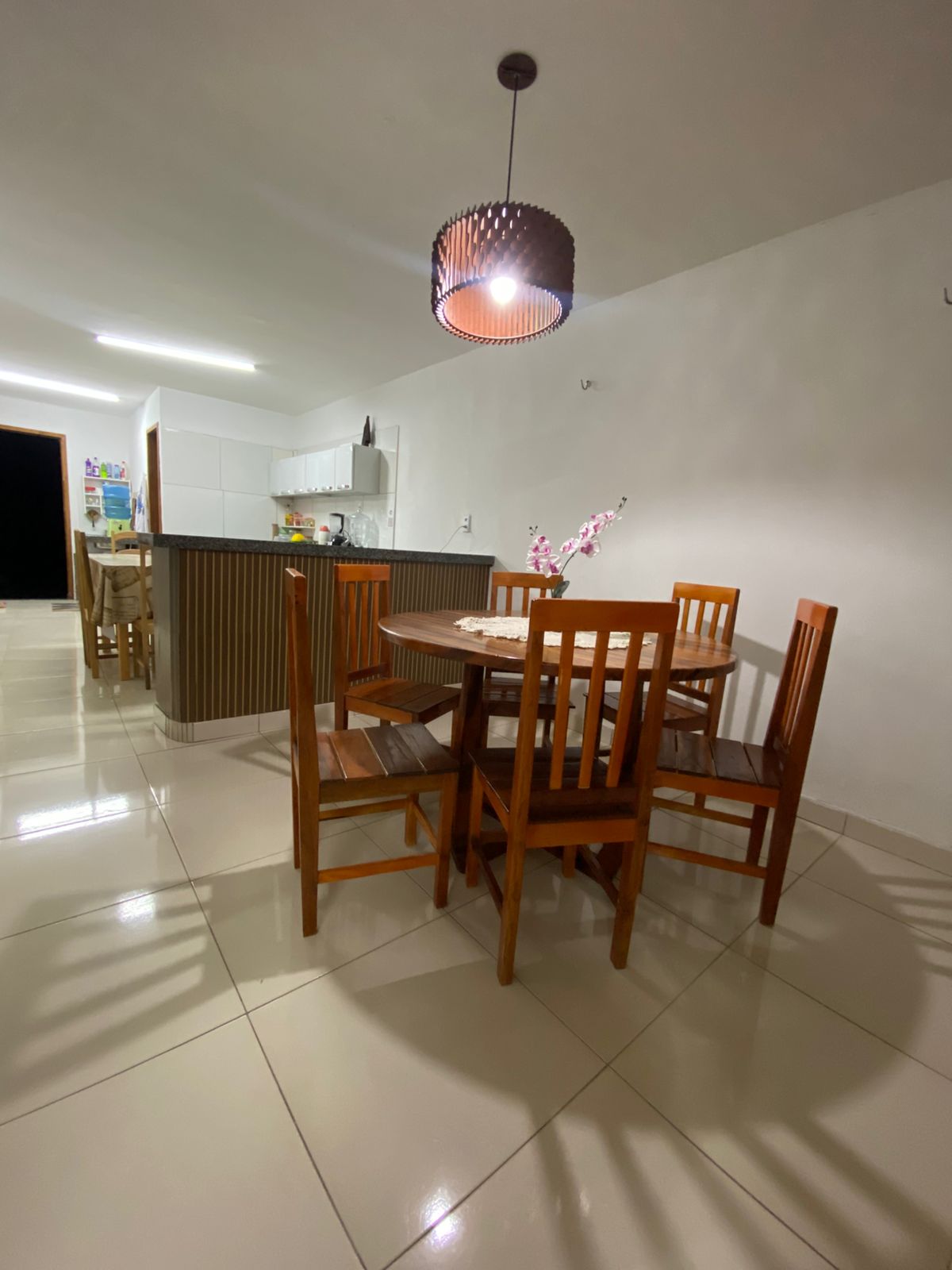 Sala de jantar: 1 mesa de madeira de seis lugares. Cozinha completa (sanduicheira, fogão tipo Cook Top de 5 queimadores, freezer de duas portas, armário planejado, panelas em geral, talheres, pratos, copos, temperos secos (condimentos). Ps.: Todos os quartos da propriedade contém um ventilador.