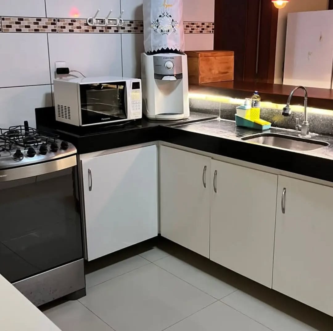 01 – Cozinha completa com geladeira, máquina de lavar louças, fogão, água mineral refrigerada (gelágua), liquidificador, microondas, freezer, sanduicheira, churrasqueira e demais utensílios de cozinha, além de máquina de lavar roupa;